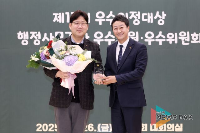 '우수의정대상'은 대한민국시도의회의장협의회가 매년 전국 광역의회의원을 대상으로, 주민참여 확대, 조례 제정, 지역현안 해결, 의정발전 기여도 등을 종합 평가해 시상하는 권위 있는 상이며, 김 의원은 2025년 한 해 동안 예산 감시, 공공기관 운영 점검, 도민 생활 밀착형 정책 제안 등 전방위 의정활동의 성과를 높이 평가받은 결과로 알려졌다.