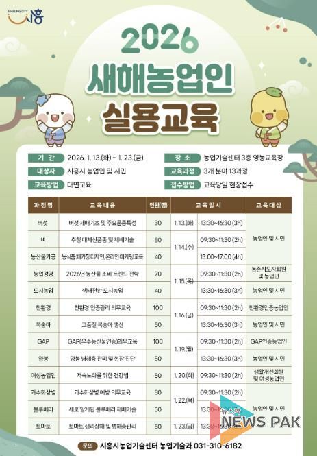 뉴스팍 배상미 기자 | 시흥시는 농업인의 전문역량 강화와 안정적인 영농 활동을 지원하기 위해 ‘2026년 새해농업인 실용교육’을 오는 1월 13일부터 23일까지 시흥시농업기술센터 3층 영농교육장에서 운영한다.