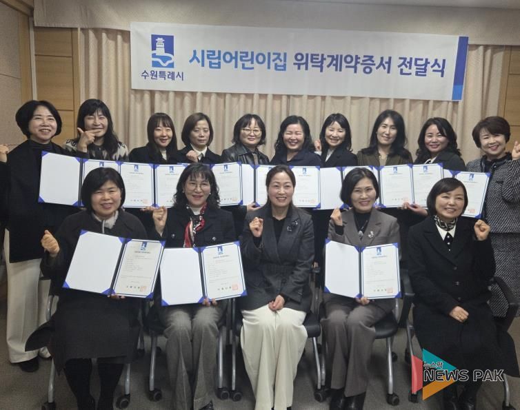 뉴스팍 배상미 기자 | 수원특례시가 29일 시청 소회의실에서 ‘시립어린이집 위탁운영 계약증서 전달식’을 열었다.