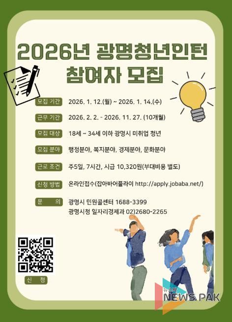 뉴스팍 배상미 기자 | 광명시가 오는 12일부터 14일까지 ‘2026년 상반기 청년 일자리 사업’ 참여자 103명을 모집한다.