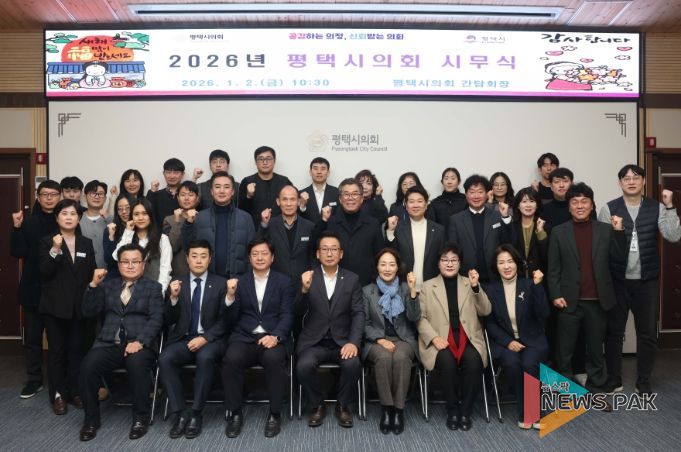 뉴스팍 이소율 기자 | 평택시의회는 2일, 시의회 간담회장에서 의원 및 의회사무국 직원 등 60여 명이 참석한 가운데 2026년 시무식을 가졌다.