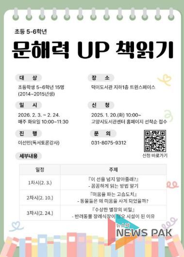 뉴스팍 배상미 기자 | 고양특례시 덕이도서관은 2026년 겨울방학을 맞아 아동과 청소년을 대상으로 한 독서·글쓰기 프로그램을 운영한다.