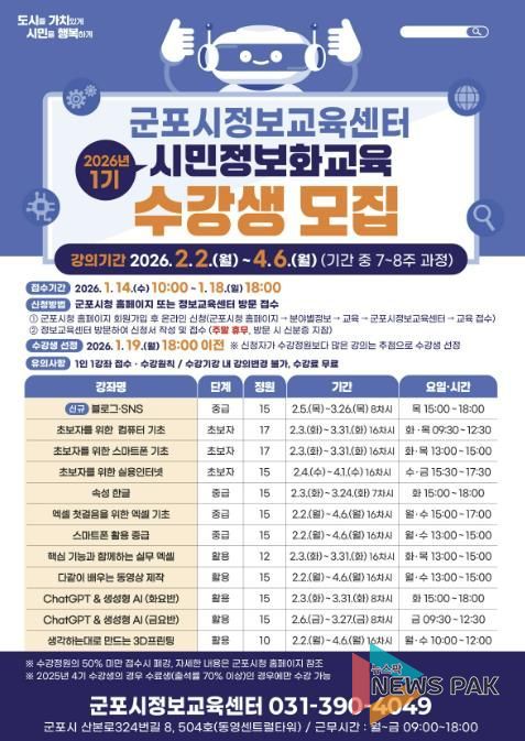 뉴스팍 배상미 기자 | 군포시는 시민들의 정보화 시대에 대한 적응 능력 향상 및 정보 소외 계층의 디지털 격차 해소를 위해 운영되는 ‘2026년 1기 시민정보화교육’의 수강생을 오는 1월 14일부터 1월 18일까지 모집한다고 밝혔다.
