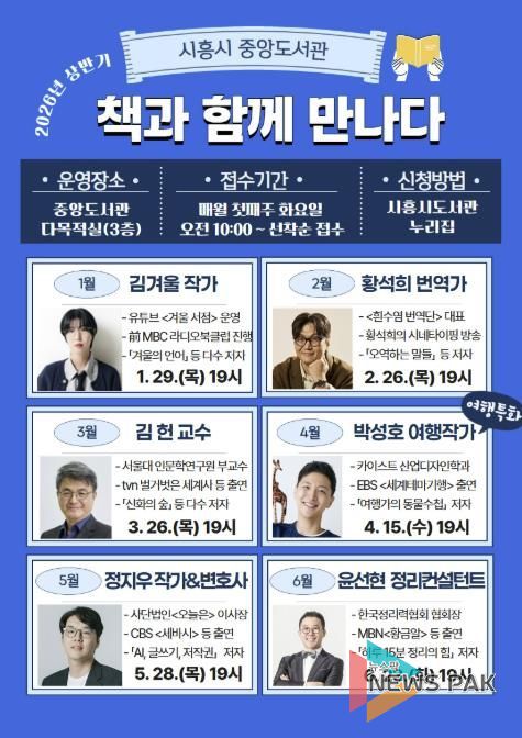 뉴스팍 배상미 기자 | 시흥시중앙도서관은 2026년 상반기 시민의 독서문화 향유 기회 확대와 인문적 소양 강화를 위해 운영하는 저자강연 ‘책과 함께 만나다’ 강연 출연진을 공개했다.