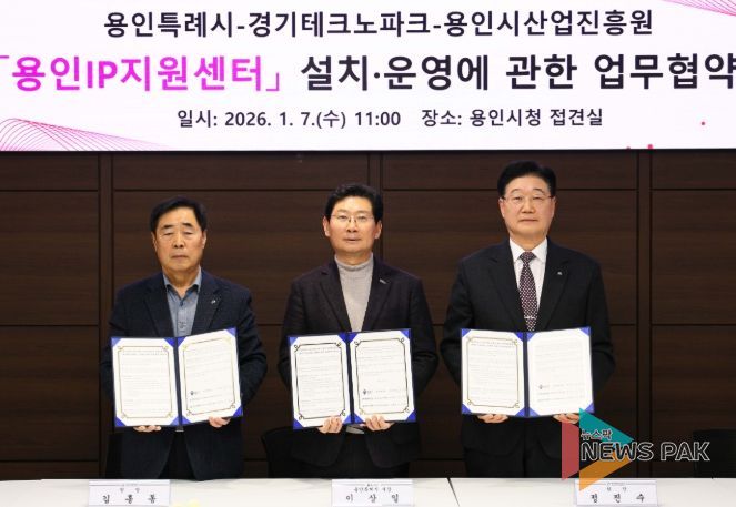 뉴스팍 배상미 기자 | 용인특례시는 7일 시청 접견실에서 경기테크노파크, 용인시산업진흥원과 '용인IP지원센터 운영에 관한 상호협력 협약'을 체결했다.