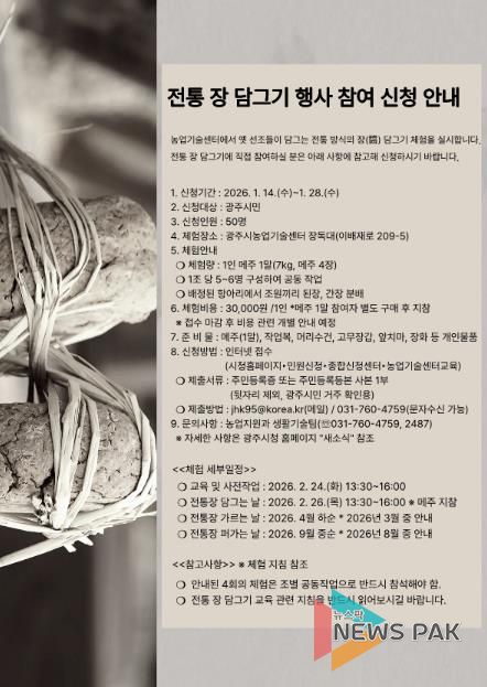 뉴스팍 이화형 기자 | 광주시는 시민들에게 전통 장류의 우수성과 발효식품의 가치를 알리고 손수 장을 담가보는 체험 기회를 제공하기 위해 ‘2026년 전통 장(醬) 담그기 체험’ 참여자를 모집한다고 9일 밝혔다.