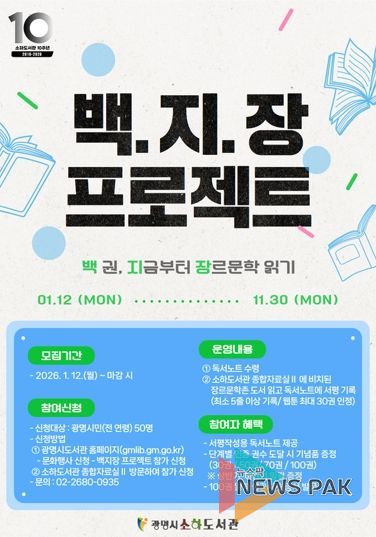 뉴스팍 배상미 기자 | 광명시 소하도서관은 오는 12일부터 장르문학 도서 100권 읽기 챌린지인 ‘백.지.장 프로젝트’ 참여자를 모집한다.