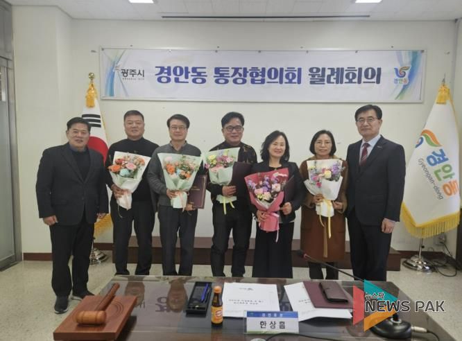 뉴스팍 이화형 기자 | 광주시 경안동은 지난 9일 동 행정복지센터에서 통장협의회 월례회의를 개최하고 지역사회 발전에 기여한 전임 통장 5명에게 감사패를 수여했다. 아울러 신규 임용 통장 5명과 연임 통장 11명에게 임명장을 전달했다.