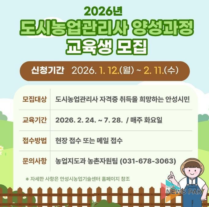 뉴스팍 배상미 기자 | 안성시농업기술센터는 1월 12일부터 2월 11일까지 도시농업 전문인력 양성을 위한 ‘제7기 도시농업관리사 양성과정’ 교육생을 모집한다.