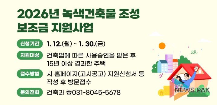 뉴스팍 배상미 기자 | 안양시는 높은 에너지 효율 달성 및 온실가스 배출 저감을 위해 노후한 건축물의 보수공사 비용을 지원하는 ‘2026년 녹색건축물 조성 보조금 지원사업’을 추진한다고 12일 밝혔다.