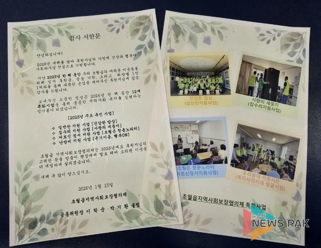 뉴스팍 이화형 기자 | 광주시 초월읍 지역사회보장협의체는 2025년 한 해 동안 지역 내 어려운 이웃을 위해 나눔을 실천한 후원자 145명에게 감사의 마음을 담은 서한문을 발송했다고 19일 밝혔다.