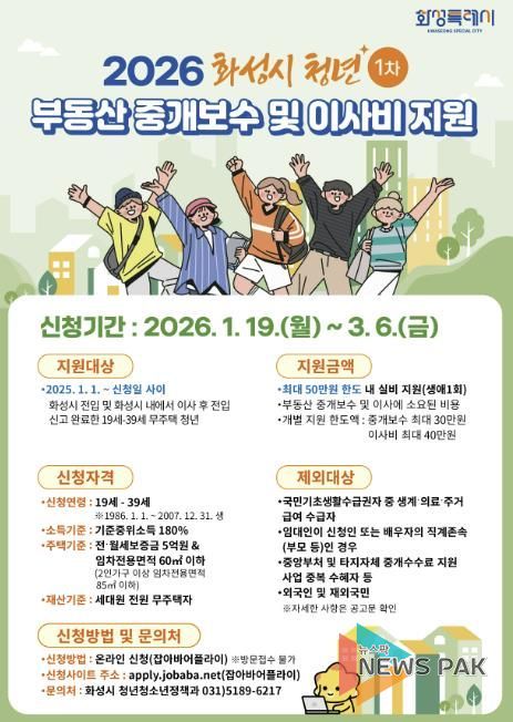 뉴스팍 류은정 기자 | 화성특례시가 19일부터 3월 6일까지 청년들의 주거비 부담 경감 및 정주 여건 향상을 위한 ‘2026년 상반기 청년 부동산 중개보수 및 이사비 지원사업’ 신청을 받는다.