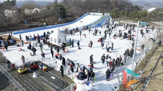 뉴스팍 배상미 기자 | 의왕시 대표 관광 명소인 왕송호수공원(왕송못동로 307)을 배경으로 펼쳐지는 겨울 축제 ‘겨울아 놀자’에서 방학을 맞은 아이들이 눈썰매를 타며 즐거운 시간을 보내고 있다.