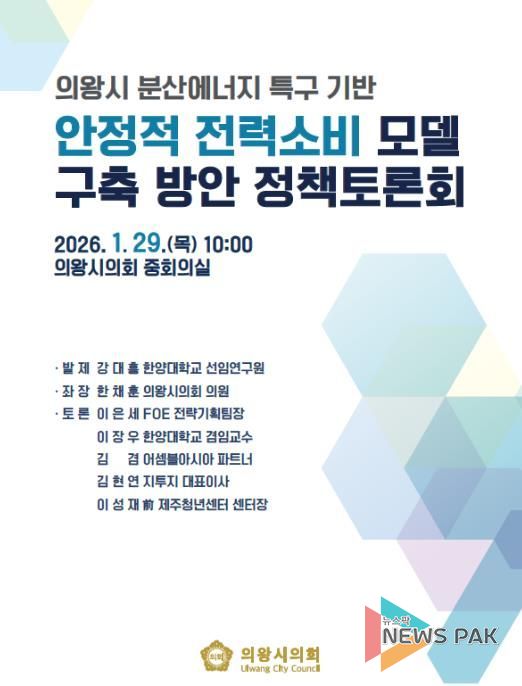 뉴스팍 배상미 기자 | 의왕시의회는 오는 29일 오전 10시, 시의회 중회의실에서 '의왕 분산에너지 특구 기반 안정적 전력소비 모델 구축 방안 정책토론회'를 개최한다고 밝혔다.