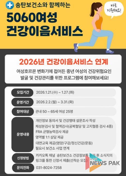 대상자 모집은 21일부터 오는 27일까지 송탄보건소 카카오톡 채널 '건강정보톡'을 통해 진행되며, 선착순 모집으로 정원 충족 시 조기마감 될 수 있다. 프로그램은 2월 2일부터 3월 31일까지 운영할 예정이다.