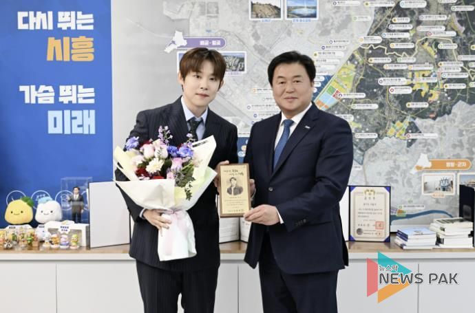 뉴스팍 배상미 기자 | 시흥시는 인기 경연 프로그램 ‘미스터트롯2’ 출신 가수 진욱을 시흥시 명예문화홍보대사로 위촉하고, 1월 28일 시장실에서 위촉장을 전달했다.