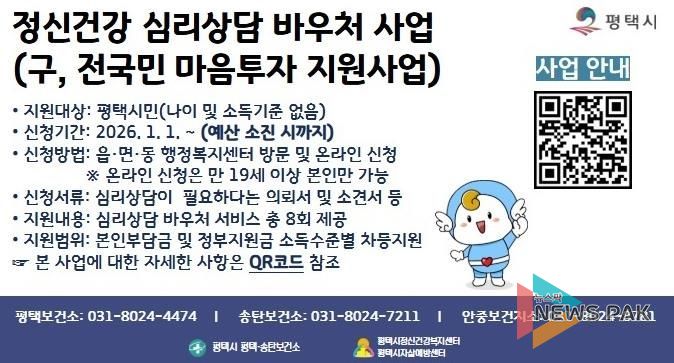 평택시는 2025년 한해 965명의 시민이 심리상담 서비스를 이용했으며, 지난 1월 5일부터 18일까지 이용자 전원을 대상으로 익명으로 진행한 만족도 조사에서 269명의 이용자가 응답했고, 서비스 전문성과 만족도 분야 등 총 10개 문항에서 100점 만점에 평균 90.3의 높은 점수로 긍정적인 평가를 나타냈다.