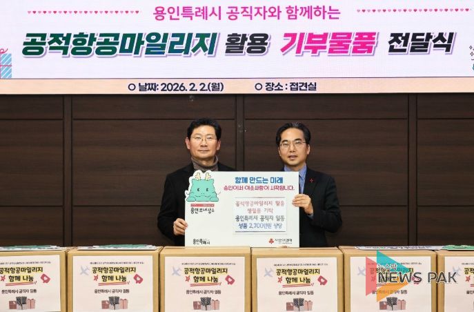 뉴스팍 배상미 기자 | 용인특례시는 2일 시청 접견실에서 ‘공적 항공마일리지 함께 나눔’ 기탁식을 열어 공직자들이 국외출장 과정에서 적립한 공적 항공마일리지를 활용한 기부 물품을 경기사회복지공동동모금회에 전달했다고 밝혔다.
