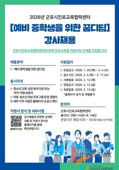 뉴스팍 배상미 기자 | (재)군포시청소년재단 군포시진로교육협력센터는 관내 예비중학생의 학교 적응과 진로 기초 역량 강화를 위해 '2026년 군포시진로교육협력센터 예비중학생을 위한 꿈디딤' 프로그램에 참여할 강사를 채용한다고 밝혔다.