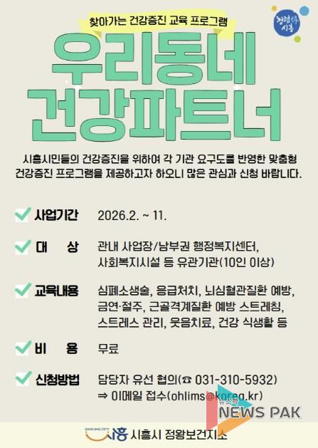 뉴스팍 배상미 기자 | 시흥시는 시간적ㆍ거리적 제약으로 건강증진 서비스를 이용하기 어려운 시민들을 위해 2월부터 11월까지 찾아가는 건강증진 프로그램 ‘우리동네 건강파트너’를 운영한다.