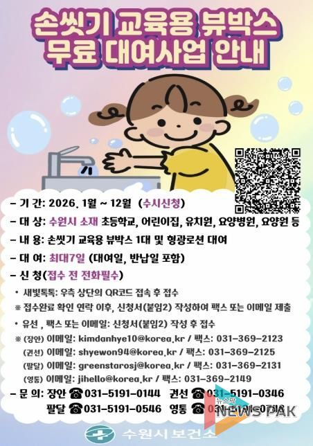 뉴스팍 배상미 기자 | 수원시보건소가 교육용 손씻기 체험 기구인 ‘뷰박스(View-box)’를 무료로 대여한다.