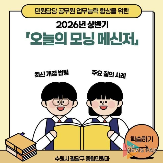 김미라 팔달구 종합민원과장은 “매일 아침 짧은 시간을 투자한 꾸준한 직무 학습이 시민들에게 더욱 정확하고 친절한 행정서비스를 제공하는 밑거름이 될 것”이라며, “앞으로도 직원들의 민원 대응 역량을 강화해 시민이 체감할 수 있는 만족도 높은 구정을 펼쳐 나가겠다”라고 전했다.