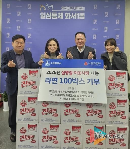 이번 기부는 유정빌딩 입주상가인 ▲스마트한결치과의원 ▲역북집 화서점 ▲언니들의 미장원 화서점 ▲GS25 화서오거리점 ▲유니베라 수원화서대리점이 지역 내 어려운 이웃을 돕기를 위해 뜻을 모아 마련했으며, 기부된 라면 100박스는 화서1동 행정복지센터를 통해 관내 저소득층 및 취약계층 가구에 전달될 예정으로, 설 명절을 앞두고 따뜻한 나눔의 의미를 더했다.