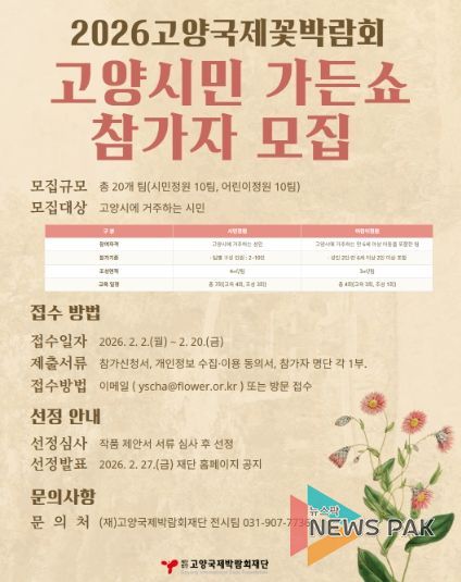 뉴스팍 배상미 기자 | (재)고양국제박람회재단이 오는 4월 24일 일산호수공원에서 개최되는 2026고양국제꽃박람회의 시민 참여 프로그램 ‘고양시민 가든쇼’의 참가자를 이달 20일까지 모집한다.