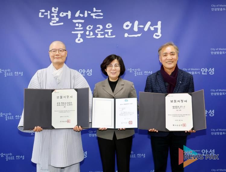 뉴스팍 배상미 기자 | 안성시는 2026년 2월 5일 오후 4시 30분 안성시청에서 '안성 청원사 대웅전'과'예기집설'의 ‘보물’ 지정 그리고 '경책신공문'의 ‘도유형문화유산’ 지정에 따른 증서를 소유자 및 소유단체에게 전달하는 수여식을 개최했다.
