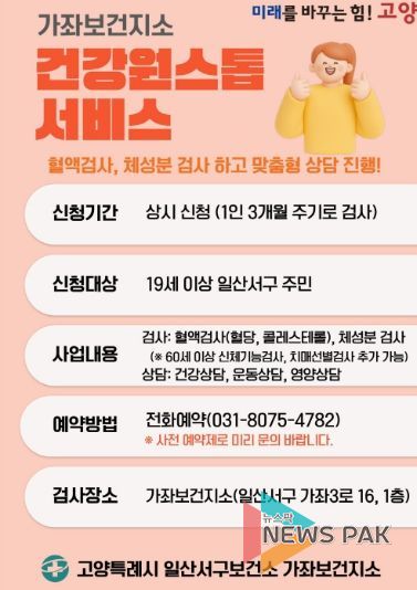 뉴스팍 배상미 기자 | 고양특례시 일산서구보건소 가좌보건지소는 지역 주민들의 만성질환을 조기에 발견하고 체계적인 건강관리를 지원하기 위해 건강원스톱 서비스를 연중 운영한다고 밝혔다.
