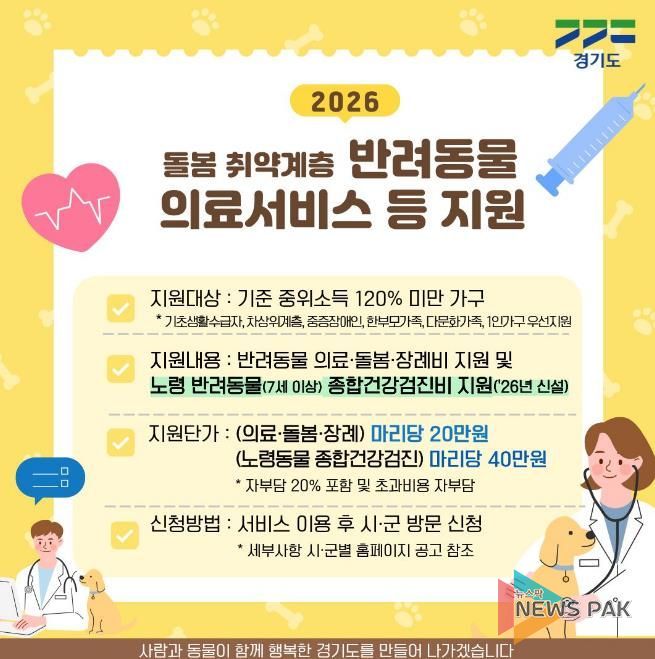 변희정 경기도 반려동물과장은 “취약계층의 외로움을 덜어줄 수 있는 반려동물이 더 오래 건강하게 곁을 지킬 수 있도록 지원 규모도 확대하고 노령 동물 종합건강검진 지원도 신설했다”며 “경기도는 사람과 동물이 서로의 온기를 나누며 끝까지 함께 걸어갈 수 있는 따뜻한 반려 문화를 만들어 가겠다”고 말했다.