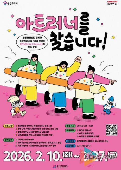 ‘아트러너’는 문화예술을 좋아하고 예술의 가치를 전하고 싶은 용인 시민이라면 누구나 지원 가능하며, 신청은 2월 10일부터 27일까지 용인문화재단 홈페이지 공지사항을 통해 가능하다. 특히 만 34세 이하 지역 청년에게는 총점의 5%를 가산점으로 부여해 지역 문화활동가로 성장할 수 있는 첫 발판을 제공할 예정이다.