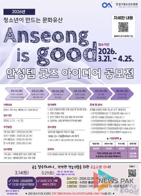 뉴스팍 배상미 기자 | 안성시청소년수련관은 청소년이 지역 문화유산을 창의적인 굿즈로 재해석하는 '2026 청소년이 만드는 문화유산 ‘안성템 굿즈 아이디어 공모전’'을 개최하고, 오는 3월부터 참가 청소년을 모집한다고 밝혔다.