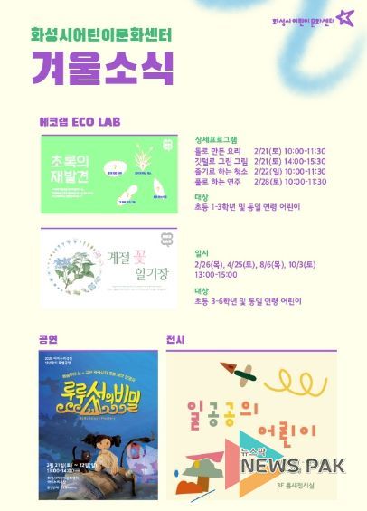 뉴스팍 류은정 기자 | 화성시어린이문화센터는 새해를 맞아 지역 생태환경을 주제로 한 특별 교육 프로그램‘에코랩(Eco Lab)’을 운영한다고 9일 밝혔다.