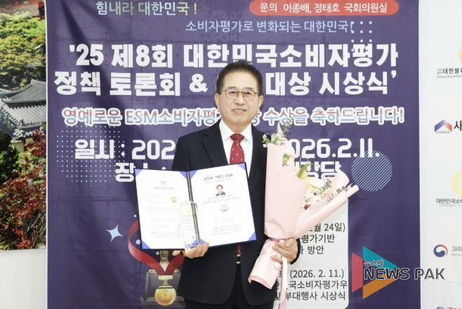 뉴스팍 이화형 기자 | 지난 11일, 국회 도서관에서 열린 2026 제8회 ESM대한민국소비자평가우수대상 정책토론회 및 시상식에서 광주시의회 허경행 의장이 지방자치/행정 부문 대상을 수상했다.