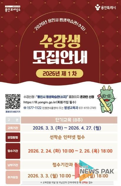 뉴스팍 배상미 기자 | 용인특례시는 24일부터 26일까지 수지구에 있는 용인시평생학습관에서 제1차 단기 교육 프로그램 수강생을 모집한다고 13일 밝혔다.