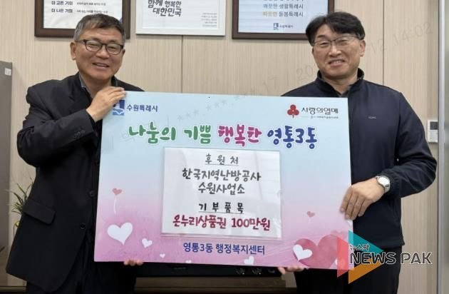 뉴스팍 배상미 기자 | 영통구 영통3동은 지난 12일, 영통3동 소재 한국지역난방공사 수원사업소으로부터 설 명절을 맞이하여 온누리 상품권 100만 원을 기탁받았다고 밝혔다.
