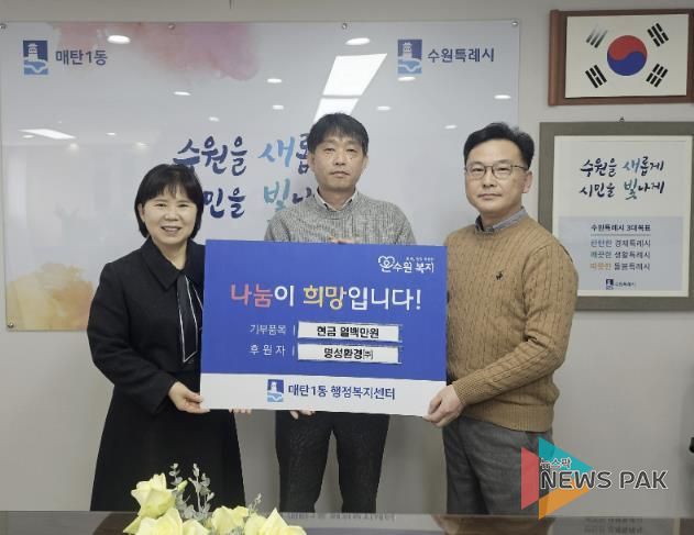 뉴스팍 배상미 기자 | 영통구 매탄1동은 지난 12일 명성환경(주)이 설명절을 맞이하여 어려운 이웃을 돕기 위해 현금 100만 원을 후원했다고 밝혔다.
