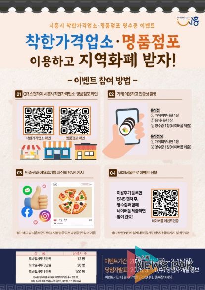 이번 이벤트는 기간 내 시민이 착한가격업소 또는 명품점포를 이용한 뒤 개인 사회관계망서비스(SNS)에 이용 후기를 게시하고, 시흥시 누리집 새소식과 시루 앱(App)에 게시된 홍보물의 정보무늬(큐알코드)를 통해 네이버 폼에 접속해 방문 후기와 영수증을 제출하는 방식으로 진행된다. 시는 참여자 가운데 무작위 추첨을 통해 총 142명에게 지역화폐 모바일 시루를 지급할 예정이며, 당첨자는 오는 3월 18일 개별 통보한다.