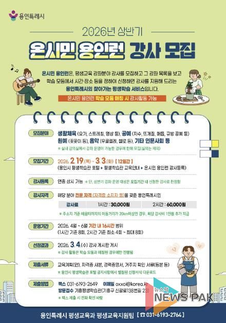 뉴스팍 배상미 기자 | 용인특례시는 19일부터 3월 3일까지 시민이 원하는 시간과 장소로 강사가 찾아가는 배달학습 ‘온시민 용인런’ 강사를 모집한다고 밝혔다.