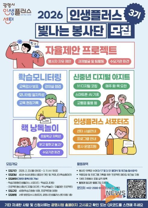 뉴스팍 배상미 기자 | 광명시 인생플러스센터가 ‘2026년 인생플러스 빛나는 봉사단’ 제3기 봉사자 40명을 2월 23일부터 3월 11일까지 모집한다.