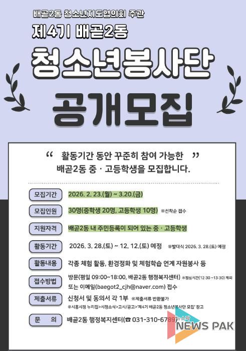 뉴스팍 배상미 기자 | 시흥시 배곧2동 청소년지도협의회는 자원봉사와 다양한 체험활동에 참여할 제4기 배곧2동 청소년봉사단원을 모집한다.