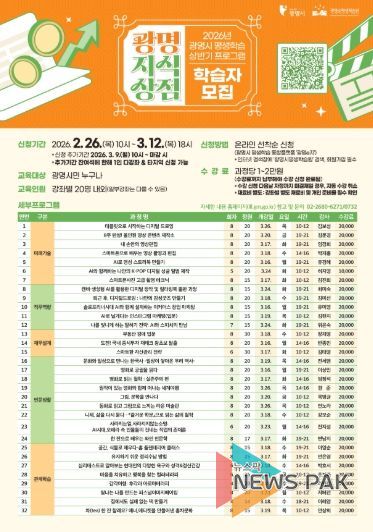 뉴스팍 배상미 기자 | 광명시 평생학습원은 26일부터 시민 맞춤형 평생학습 프로그램인 ‘광명지식상점’ 2026년 상반기 학습자 700여 명을 모집한다.