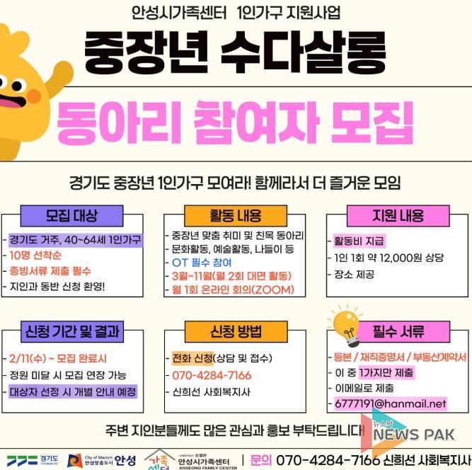뉴스팍 배상미 기자 | 안성시 가족센터는 경기도 거주 중장년 1인 가구(40세~64세)를 대상으로 사회적 관계망 형성을 위한 ‘중장년 수다살롱’ 동아리 참여자를 모집한다.