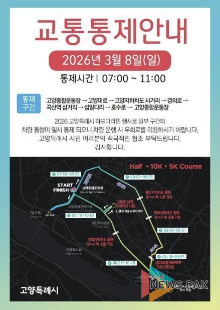뉴스팍 배상미 기자 | 고양특례시는 오는 8일‘2026 고양특례시 하프 마라톤 대회’ 개최 로 고양시 주요 도로에서 교통 통제가 이루어짐에 따라 시민들의 적극적인 협조를 당부한다고 밝혔다.