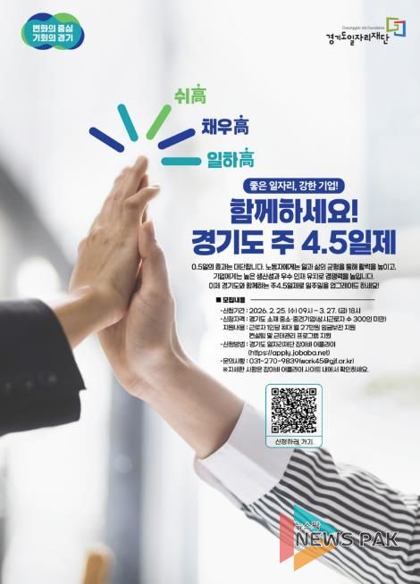 뉴스팍 배상미 기자 | 경기도와 경기도일자리재단은 2026년에도 ‘경기도 주 4.5일제 시범사업’을 이어가며 27일까지 신규 참여기업을 모집한다.