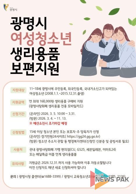 뉴스팍 배상미 기자 | 광명시가 4일부터 청소년의 건강권과 인권 보장을 위해 ‘여성청소년 생리용품 보편지원 사업’ 신청을 받는다.