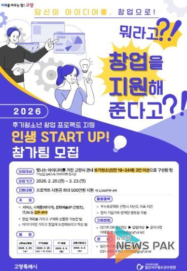 뉴스팍 배상미 기자 | 고양시청소년재단 일산서구청소년수련관은 청소년 또는 청년들이 자신의 삶과 진로를 주도적으로 설계하고 실행 역량을 키울 수 있도록 지원하는 ‘2026 인생스타트업’ 사업 참여자를 모집한다.