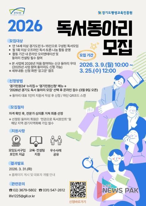 뉴스팍 배상미 기자 | 경기도는 도민의 자발적 독서 활동을 지원하고 책 읽는 문화를 확산시키기 위해 9일부터 25일까지 ‘2026년 경기도 독서동아리’ 400곳을 모집한다.