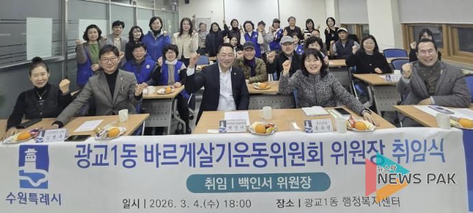 신임 백인서 광교1동 바르게살기운동위원회 위원장은 “지역사회와 적극 소통하며 주민 화합과 기초질서 확립을 위해 앞장서겠다. 따뜻하고 안전한 광교1동을 만드는 데 최선을 다하겠다”고 밝혔다.